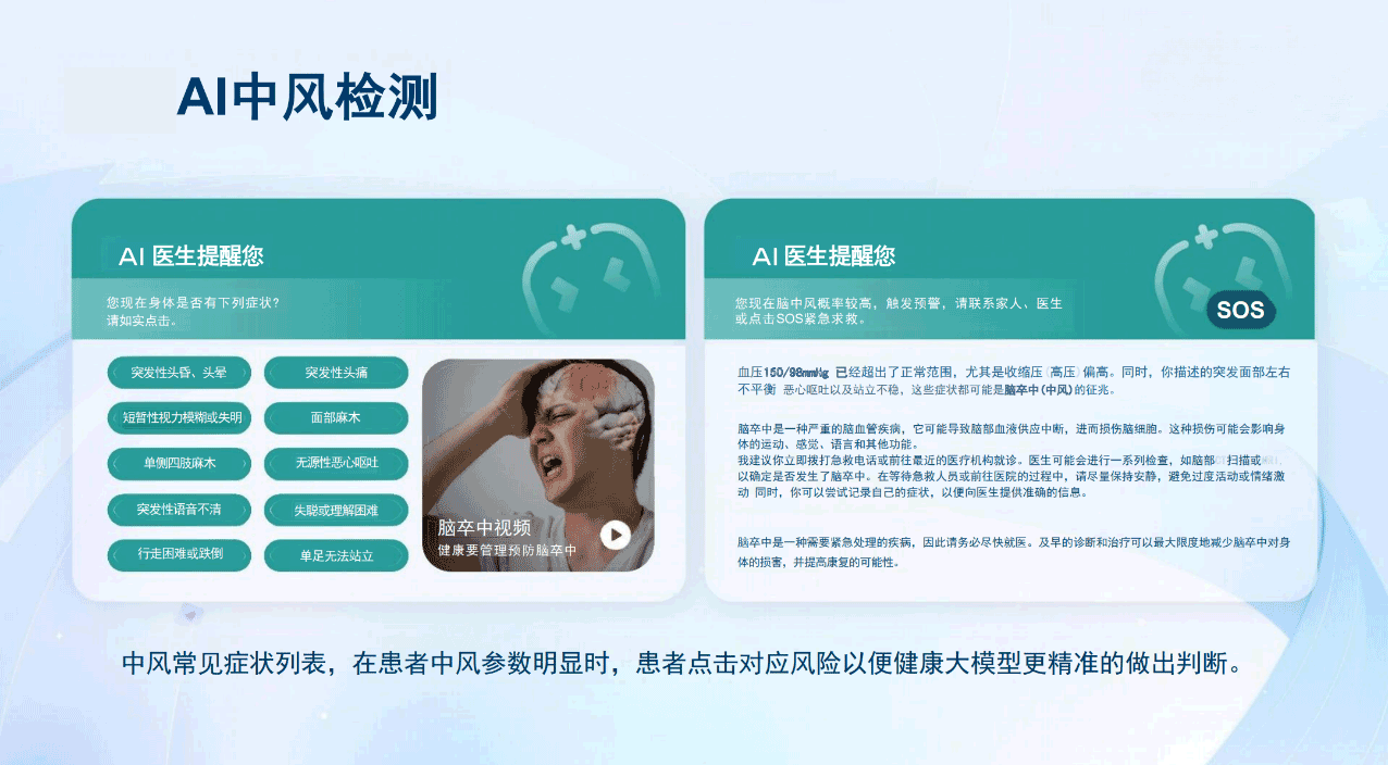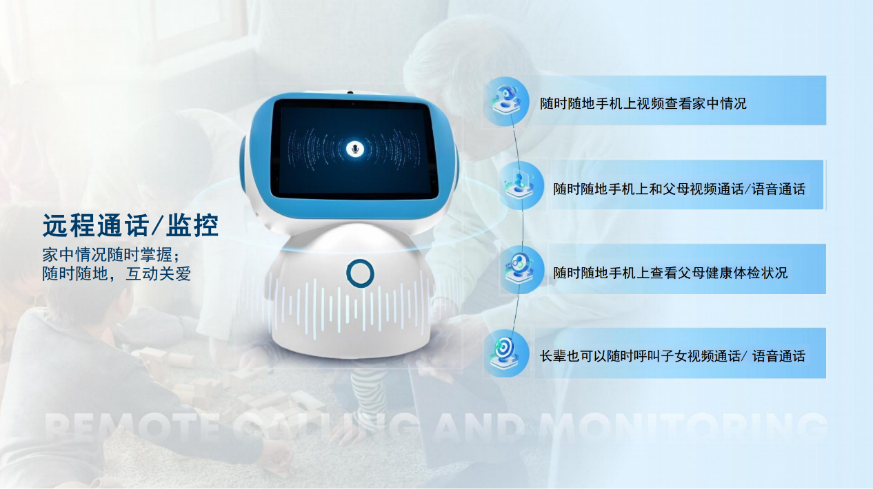健康检查|智能诊断|智能问诊|健康咨询|娱乐学习|互动陪伴|智能家居|名医推荐|远程问诊|理疗护理|紧急救援|远程监控|医护交流|健康管理|安全看护|视频通话